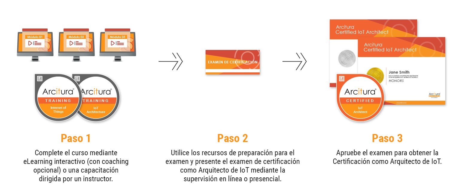 Complete el curso de Arquitectura de IoT y, opcionalmente, acredítese como Arquitecto de IoT aprobando el examen de certificación. Puede comprar el curso ahora y obtener el examen más tarde, o puede obtenerlos juntos con un descuento como parte del Paquete de certificación.