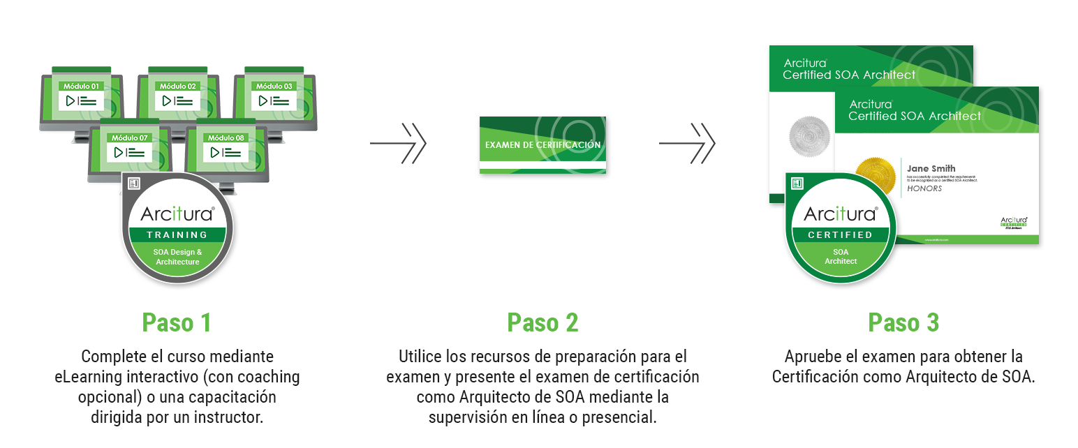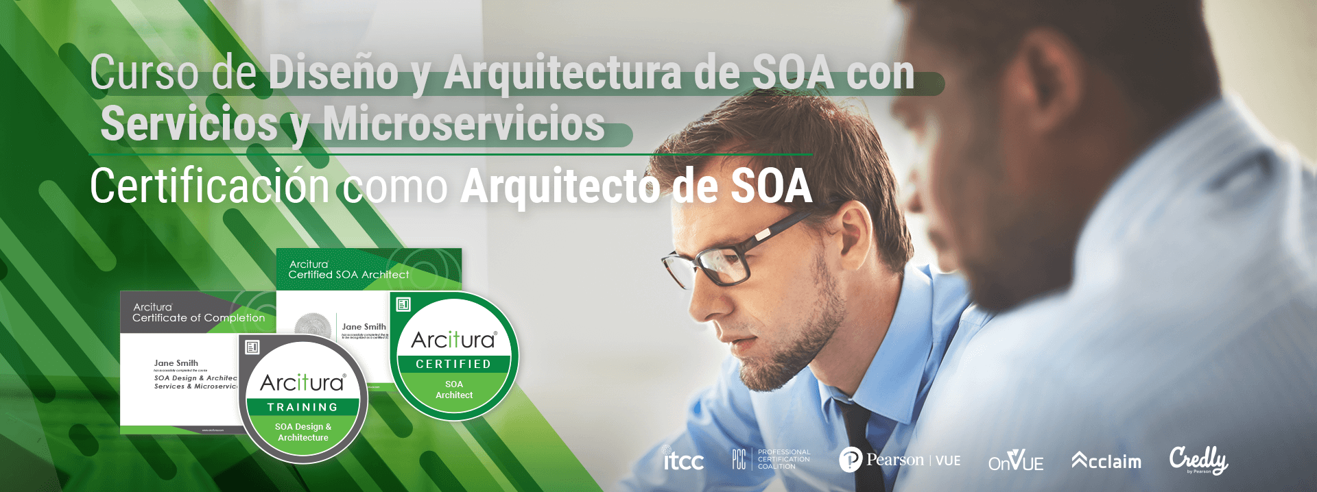 Complete el curso de Diseño y Arquitectura de SOA con Servicios y Microservicios y, opcionalmente, acredítese como Arquitecto de SOA aprobando el examen de certificación. Puede comprar el curso ahora y obtener el examen más tarde, o puede obtenerlos juntos con un descuento como parte del Paquete de certificación.