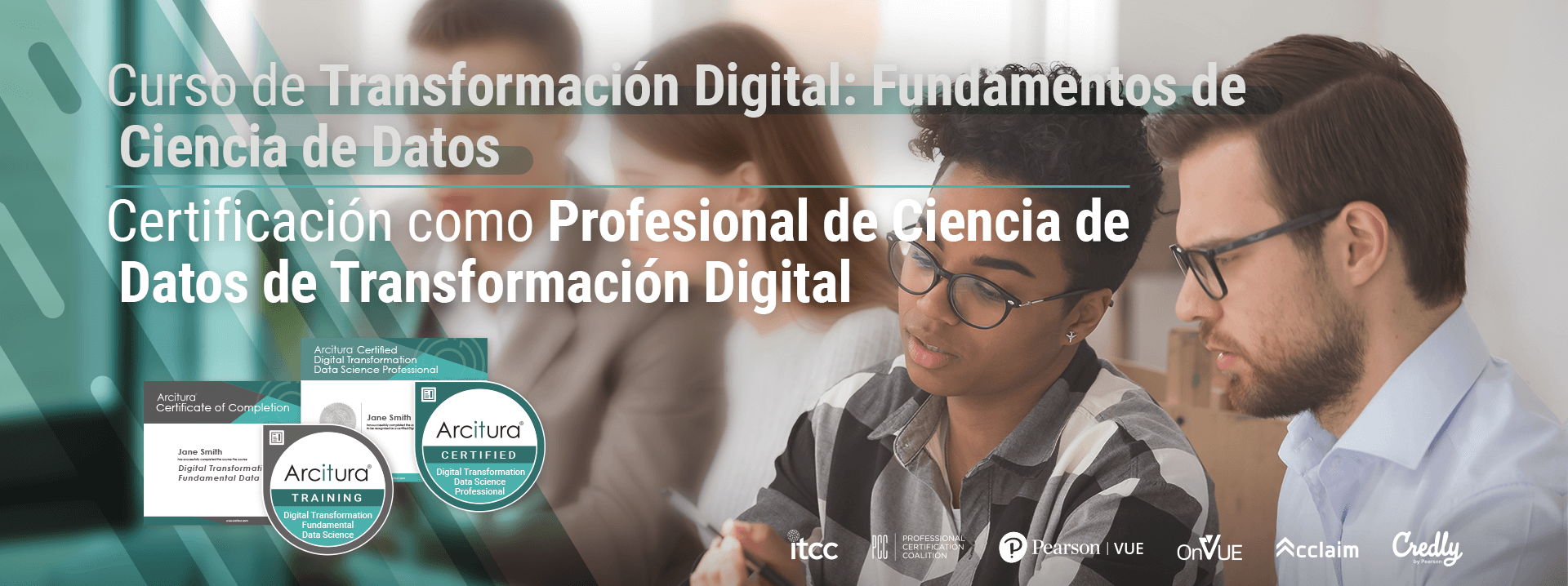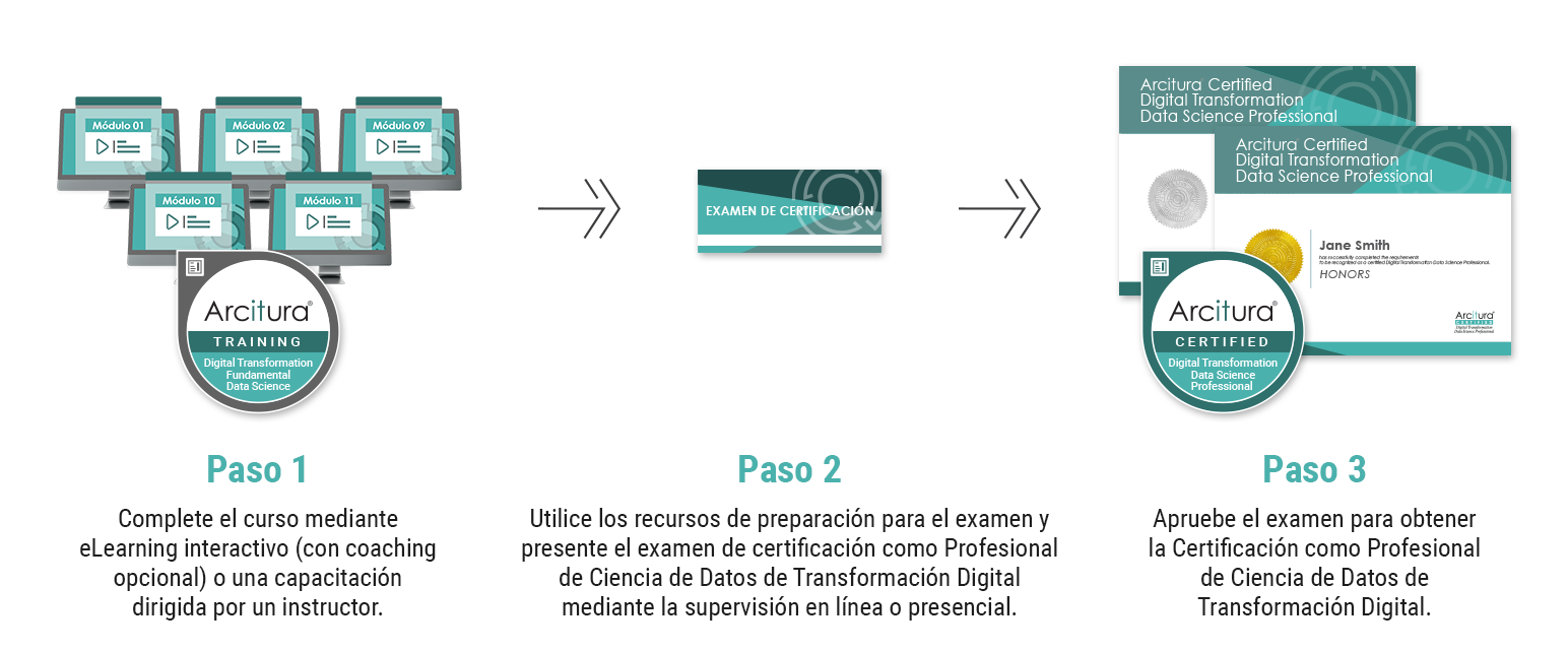 Complete el curso de Transformación Digital: Fundamentos de Ciencia de Datos y, opcionalmente, acredítese como Profesional de Ciencia de Datos de Transformación Digital aprobando el examen de certificación. Puede comprar el curso ahora y obtener el examen más tarde, o puede obtenerlos juntos con un descuento como parte del Paquete de certificación.
